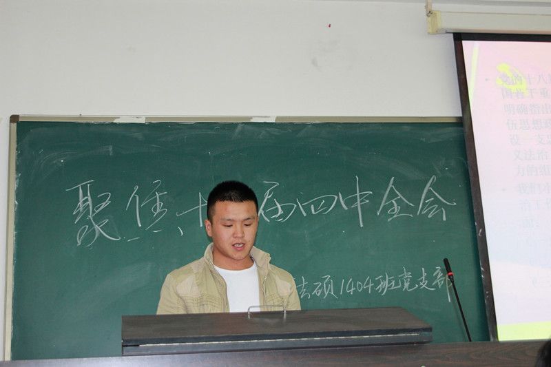 为了让班级党员、预备党员以及有意愿入党的同学充分认识党的十八届四中全会的重大意义,准确把握党的十八届四中全会的精神实质,学习贯彻好十八届四中全会精神,2014级法硕4班党支部于2014年11月19日下午在文添楼210开展“聚焦十八届四中全会”学习研讨会。该会议由组织委员于洪洋全程主持。