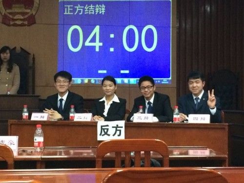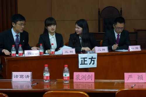 在潘书记的鼓励和方泳桥、汪华珍同学的耐心指导下,法学法硕代表队的辩手们认真备战决赛。2014年3月31日晚7:00,决赛在文泰楼模拟法庭(二)举行。法学法硕代表队作为反方认为审判时参考判例在我国弊大于利,国际法班代表队则持相反观点。正反双方各立陈词,激烈地辩论,场上掌声和欢呼声不断。 【】