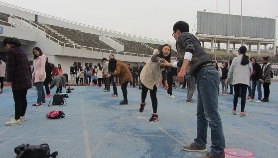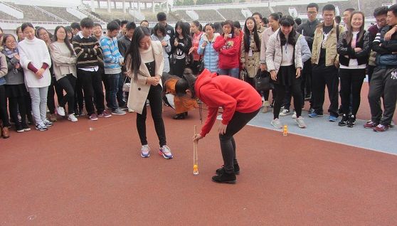 第三项是“抛绣球”。抛绣球也要求两名同学参加,接球者和抛球者相隔5米,用大小相同的篓子接球,抛球者共抛出10个球,接球者接到球数多者获胜。虽然天气有些寒冷,但这并没有阻挡同学们参赛的热情。参赛同学排队准备,现场忙而不乱,比赛激烈而有趣。观众们不时地鼓掌呐喊,为赢得比赛的同学欢呼。