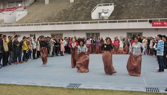 本次趣味运动会共分为五个比赛环节。第一项是“袋鼠跳”。袋鼠跳的游戏规则要求参赛选手穿上袋子,以走、跑、跳等各种方式向终点行进,行进过程中必须保证双腿在袋子里,用时最少者获胜。各学院同学积极参与,这样的比赛,除了显示出同学们的竞技精神外,还多了几分趣味,参赛同学乐在其中。整个比赛趣味性十足,十分精彩。