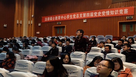 (通讯员 陈吉 摄影 乔佳龙)为了深入贯彻落实党的十九大精神,进一步学习党的历史与文化,法硕中心学生党总支于2017年11月28日晚6:30在文泰楼模拟法庭一举办了第四届党史党情知识竞赛。法硕中心学生党总支书记潘丰文、辅导员李杨、刘翔出席了本次活动,2016级、2017级共7支队伍参加了本次比赛。