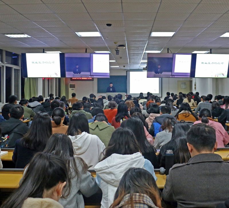 第二场讲座于2018年11月22日晚7点在文添楼501教室举行。讲座伊始,余金聪老师以一个“摸鼻子摸耳朵”小游戏引入主题,向在坐同学发问“我们面对的压力有哪些”。同学们表示,在校的压力主要来自于求职、学业、情感等方面。对此,余老师分别从压力的概念、压力产生的原因、压力的影响、压力的应对四个方面予以解读。余金聪老师的讲课非常生动,语言幽默风趣,穿插在讲座过程中的小测试、小短剧、提问等互动使整场讲座的气氛变得很热烈,现场的同学们反馈积极。最后,余金聪老师特别提醒大家注意:一定要不断尝试,不设限,不比较,不放弃,希望永远都在!