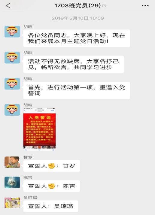 (通讯员 杨雨晴 摄影 杨雨晴)法硕1703班党支部于2019年5月10日晚上7点在党支部微信群组织开展了“新时代呼唤新青年,新青年立志新时代”的主题党日活动,活动由书记胡晗主持。学习方式以支部讨论为主,每个党员发表自己学习心得。