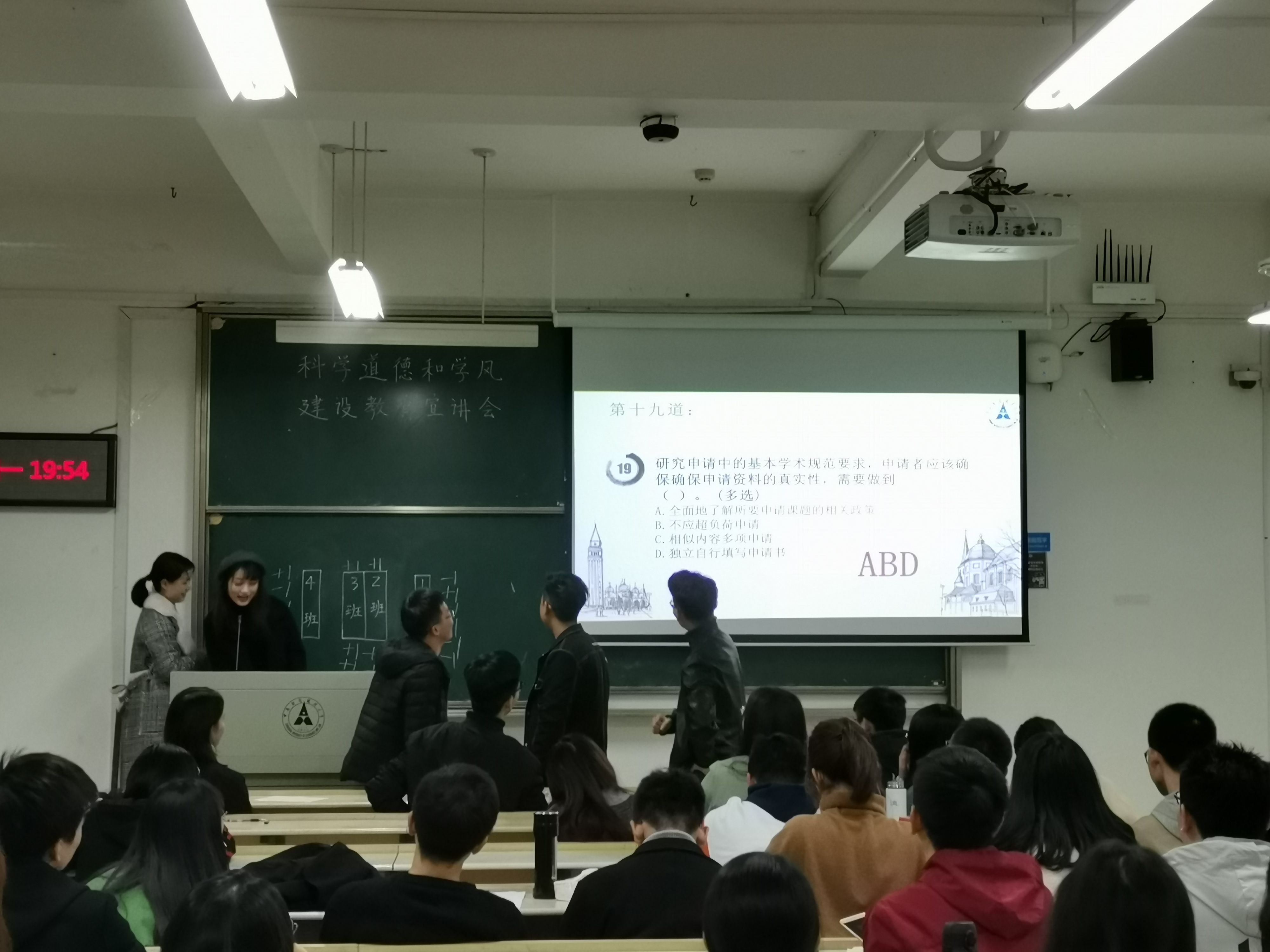 本次活动共分观影教育、知识竞赛、署名立誓三个环节。活动伊始,主持人为大家播放了 “何谓学术不端”、“汉芯事件”、“学术规范标准”三段视频,从学术不端的定义、实例和行为准则等方面详细说明了学术科研活动的特殊性,我们作为从事学术科研活动的群体要比其他社会群体更注重追求真理、严谨求实、诚信负责、真诚协作。学术失范有着诸多成因,这一问题的出现既有社会不良风气的影响,也有学术科研体制中存在的弊端和漏洞。对学术科研而言,科学道德与学风建设直接关系到科学的繁荣发展。通过此次观影,同学们进一步领悟到了科学道德和学风建设的必要性。