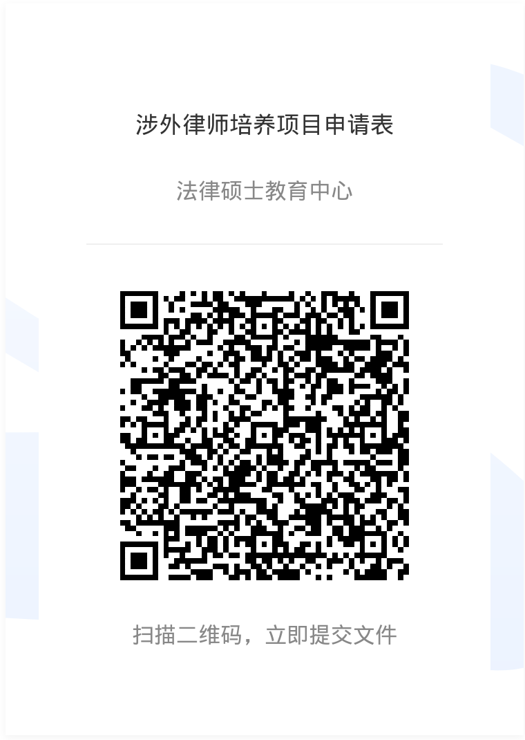 申请该项目的考生需填写《中南财经政法大学2021年涉外律师研究生招生项目申请表》(见附件1),并将申请表的清晰电子版与英语、小语种水平成绩单、证书等证明材料一同打包,于6月18日前发送至法律硕士教育中心邮箱:flssjyzx@zuel.edu.cn,并扫描二维码填写相关信息,邮件标题及材料包命名规则为:涉外律师申请+考生编号+姓名。