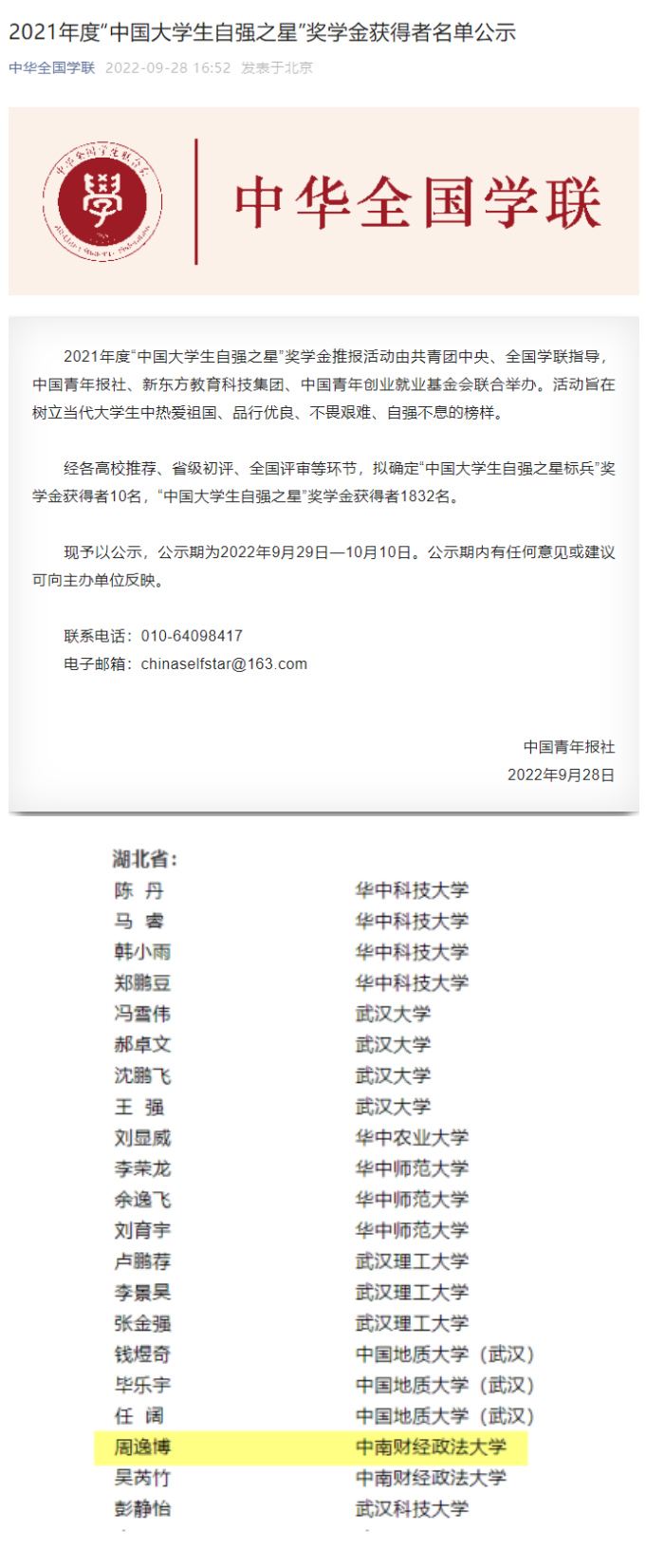 (通讯员 张逸颖)近日,2021年度“中国大学生自强之星”奖学金获得者名单揭晓,经学校推荐、省级初评、全国评审等环节,法律硕士教育中心2019级卓越班周逸博同学荣获2021年度“中国大学生自强之星”奖学金。“中国大学生自强之星”奖学金推报活动由共青团中央、全国学联指导,中国青年报社、新东方教育科技集团、中国青年创业就业基金会联合举办。2021年度“中国大学生自强之星”奖学金推报活动以“请党放心 强国有我”为主题,从全国各高校寻访产生一批在爱国修德、勤学求真、创新创业、社区实践、奋斗力行五个方面具有突出事迹的青年大学生,以引领广大学子坚定理想信念、传承红色基因,鼓励新时代青年以青春之我践行“强国有我”的青春宣言。在此次评选当中,一共评选出“中国大学生自强之星标兵”奖学金获得者10名,“中国大学生自强之星”奖学金获得者1831名。
