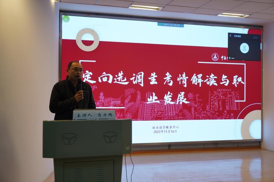 (通讯员 王济安 摄影 廉曜菖)为帮助同学们更全面、深入地了解选调生政策,科学合理地准备选调生考试,11月17日下午,法律硕士教育中心在文谭楼308以线上+线下的形式举办了“济世杯”职场礼仪大赛之定向选调生考情解读与职业发展讲座。本次讲座邀请到校就业指导服务中心肖力玮老师主讲,法硕中心团总支书记刘翔、辅导员余安琪、马晨娇出席本次活动,法硕中心和部分学院学生参加了本次活动。
