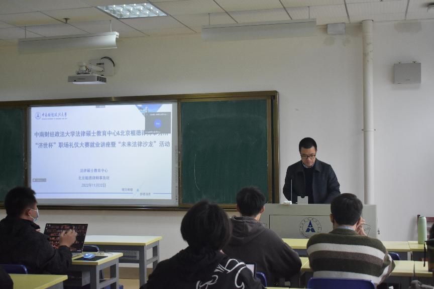 (通讯员 贾君瑶 摄影 刘玮琨)11月22日下午,法律硕士教育中心在文澴楼515教室以线上线下相结合的方式举办了“济世杯”职场礼仪大赛就业讲座暨北京植德律师事务所“未来法律沙龙”活动。本次活动邀请到北京植德律师事务所合伙人崔白律师、龚文静律师、肖亮律师和沈诗淳律师主讲。法学院党委副书记、法律硕士教育中心学生党总支书记易育老师,法律硕士教育中心团总支书记刘翔老师出席本次活动。活动由刘翔老师主持。