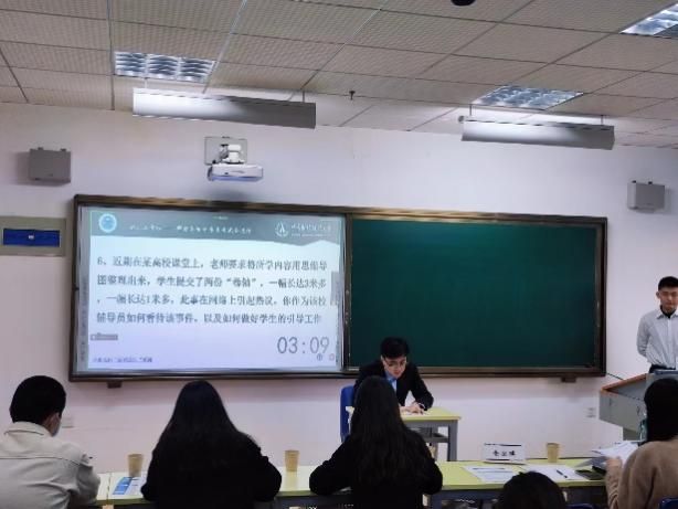 在半结构化模拟面试环节,工作人员根据前期的报名情况选择10名同学参与模拟面试,选手按照顺序依次上台进行自我介绍和随机作答,题目主要涉及辅导员工作内容、案例分析和理论知识等方面。现场嘉宾依次对10位同学的表现作点评。马晨娇从选手们的具体回答内容入手,与同学们分享了处理学生受伤等突发事件的经验,提供了一些答题的技巧。杨雅婷从选手整体表现出发,建议同学们一定要注意面试的仪态,同时要结合自身优势在面试中进行回答。章伟晨建议同学们要有前瞻思维,提前预判充分准备,根据自己的简历准备面试官可能会问的问题,做到心中有数,胸有成竹。李祥栋肯定了在场同学的表现,表示如果想要回答出彩,同学们应该有辩证思维,从实际出发,对问题进行正反两面的剖析。