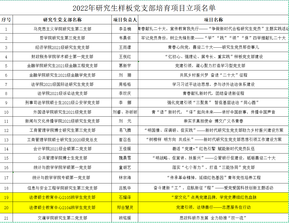 (通讯员 余安琪 学生通讯员 郑合慧灵)2022年12月,法硕2104、2105班学生党支部顺利通过校党委组织部、党委研究生工作部2022年“不忘初心跟党走·青春筑梦新时代”研究生样板党支部培育项目的结项验收。其中,法硕2104班学生党支部于同月的“2022年研究生样板党支部培育项目成果展评会”中荣获三等奖。