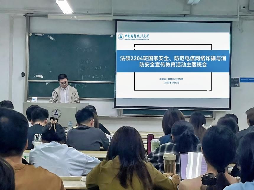 (通讯员 代诗涵 摄影 于文轩)为增强同学们的安全防范意识、普及安全知识、维护校园文明与安全稳定,在辅导员马晨娇老师的指导下,法硕2204班学生党支部与2023年4月12日在文添楼310教室组织召开了国家安全、防范电信网络诈骗与消防寝室安全宣传教育活动主题班会。班会由班长汪星宇同学主持,2204班全体同学参加了此次班会。