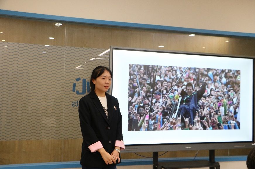 第八位选手是来自2022级非法2班的邱婷兴,她的主题是“新时代青年人当弘扬历史主动精神,勇担时代使命”。她以“北极鲶鱼”事件引入,介绍中国共产党人在百年党史中展现出的历史主动精神,号召青年人应当尊重历史发展规律,在历史中吸取经验教训,发挥历史主动性,在实现中华民族伟大复兴的中国梦的历程中找到属于新时代青年人的使命并挺膺担当,乘势腾飞。