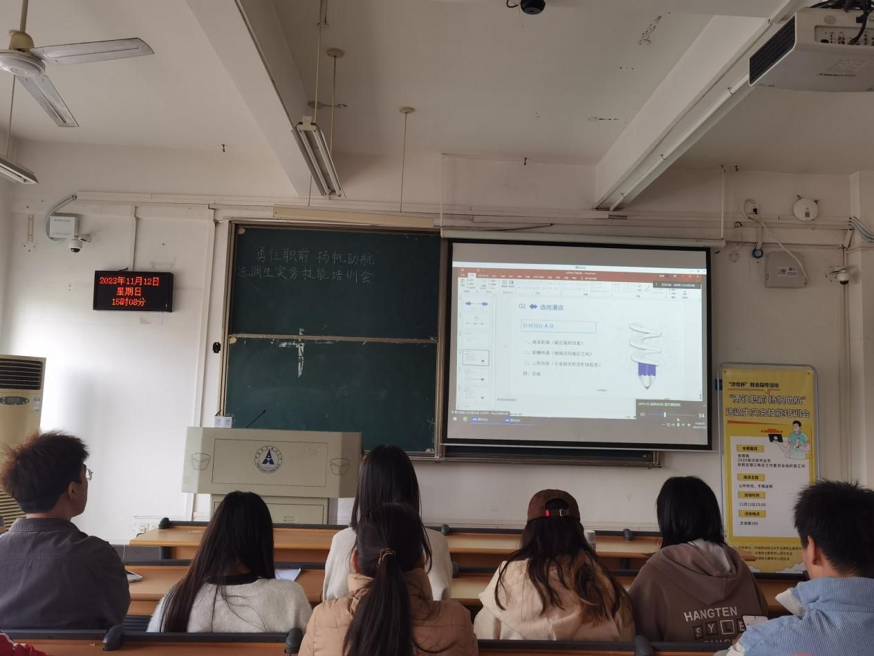 (通讯员 余安琪 万晨颖 摄影 乔冰洁)为鼓励更多同学加入赴基层就业的队伍,帮助同学们充分了解公务员、选调生考试的形式与内容,掌握笔、面试技巧,助力学生顺利上岸,法律硕士教育中心于2023年11月12日15:00以线上线下相结合的形式在文添楼209教室举办了2023年“济世杯”系列就业指导活动之“勇往职前 扬帆助航”选调生实务技能第四次培训会。