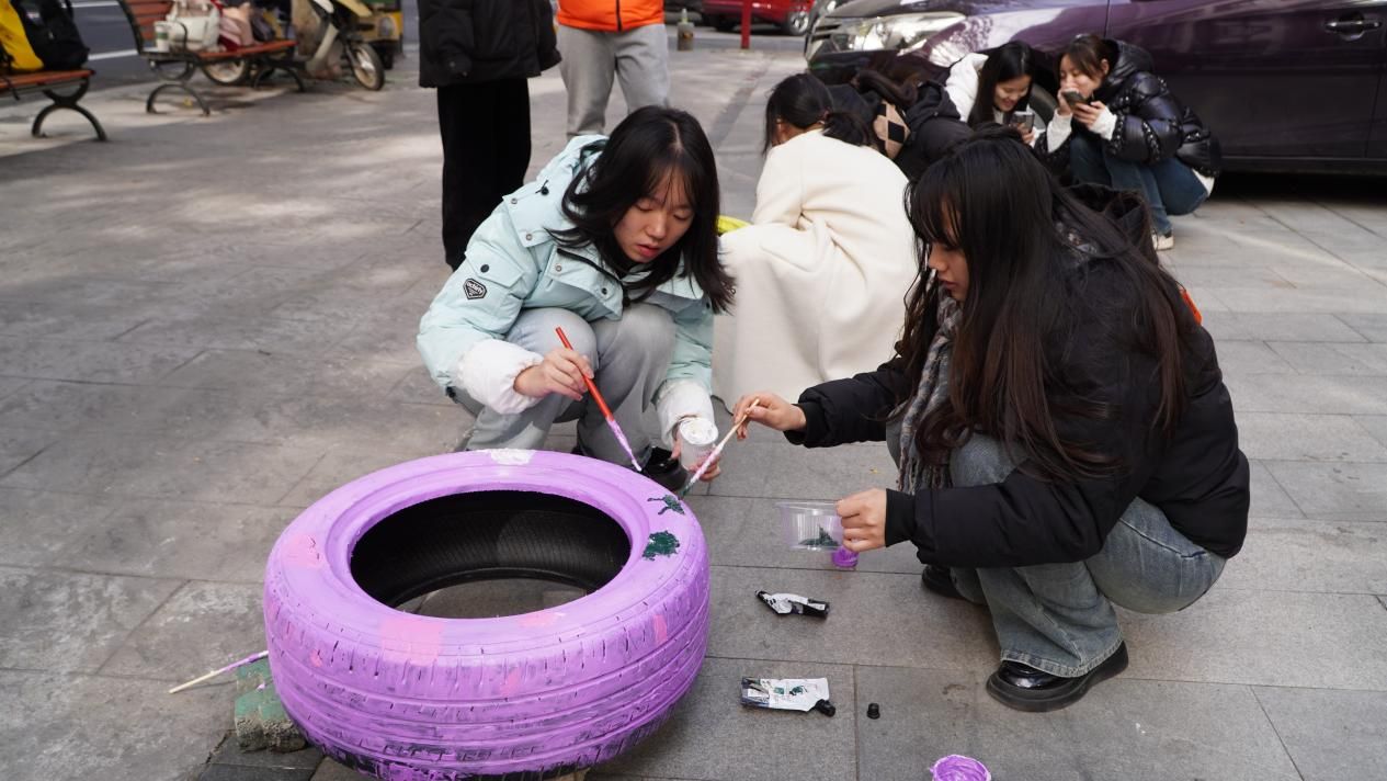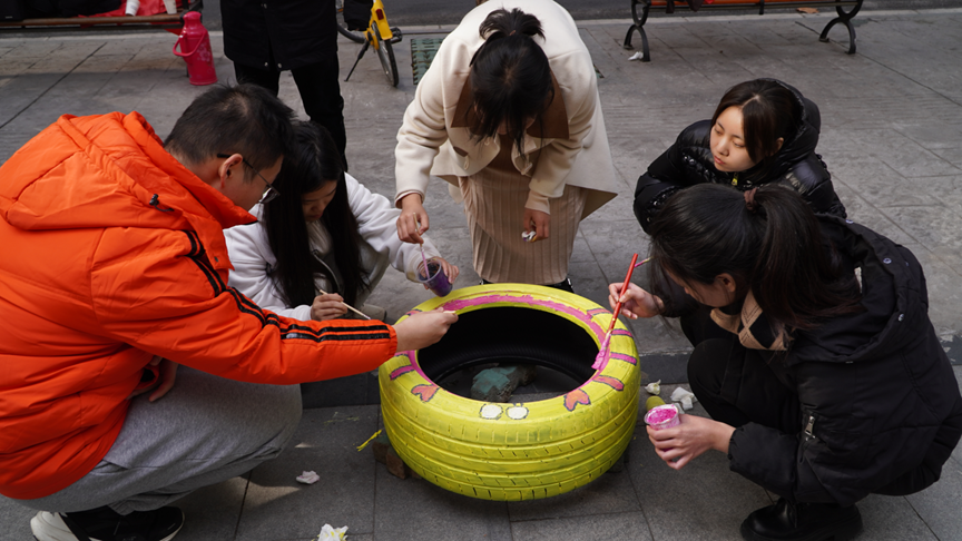 最终,经过2个多小时的努力,四个别具一格的涂鸦轮胎诞生了,它们分别是“小螃蟹”、“甜甜圈”、“小花朵”和“星空”。志愿者们用他们的巧手变废为宝,勾勒出青春色彩,为凛冽萧瑟的冬日街道增添了一抹靓丽的风景。