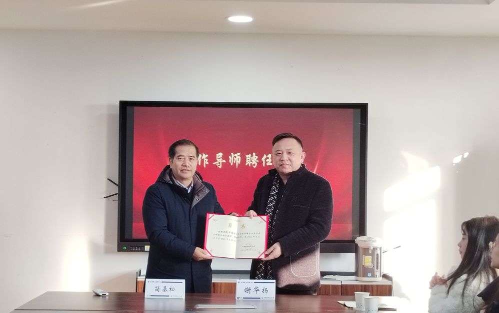 合作导师聘任仪式上,简基松为谢华扬颁发合作导师聘书。