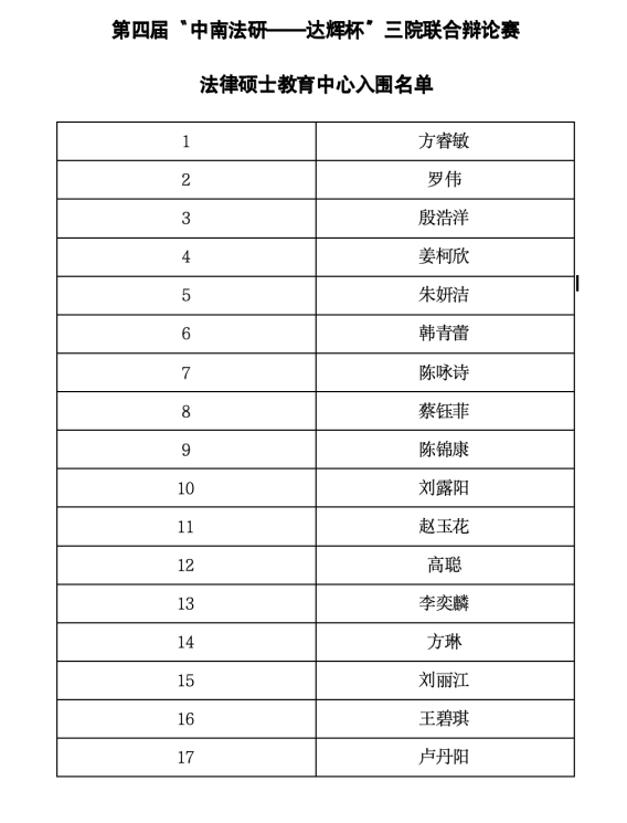 经过三个小时的激烈角逐,方睿敏、罗伟、殷浩洋、姜柯欣等17名选手从本次资格赛中脱颖而出,他们将参加第四届“中南法研——达辉杯”三院联合辩论赛初赛,期待他们接下来的精彩表现!