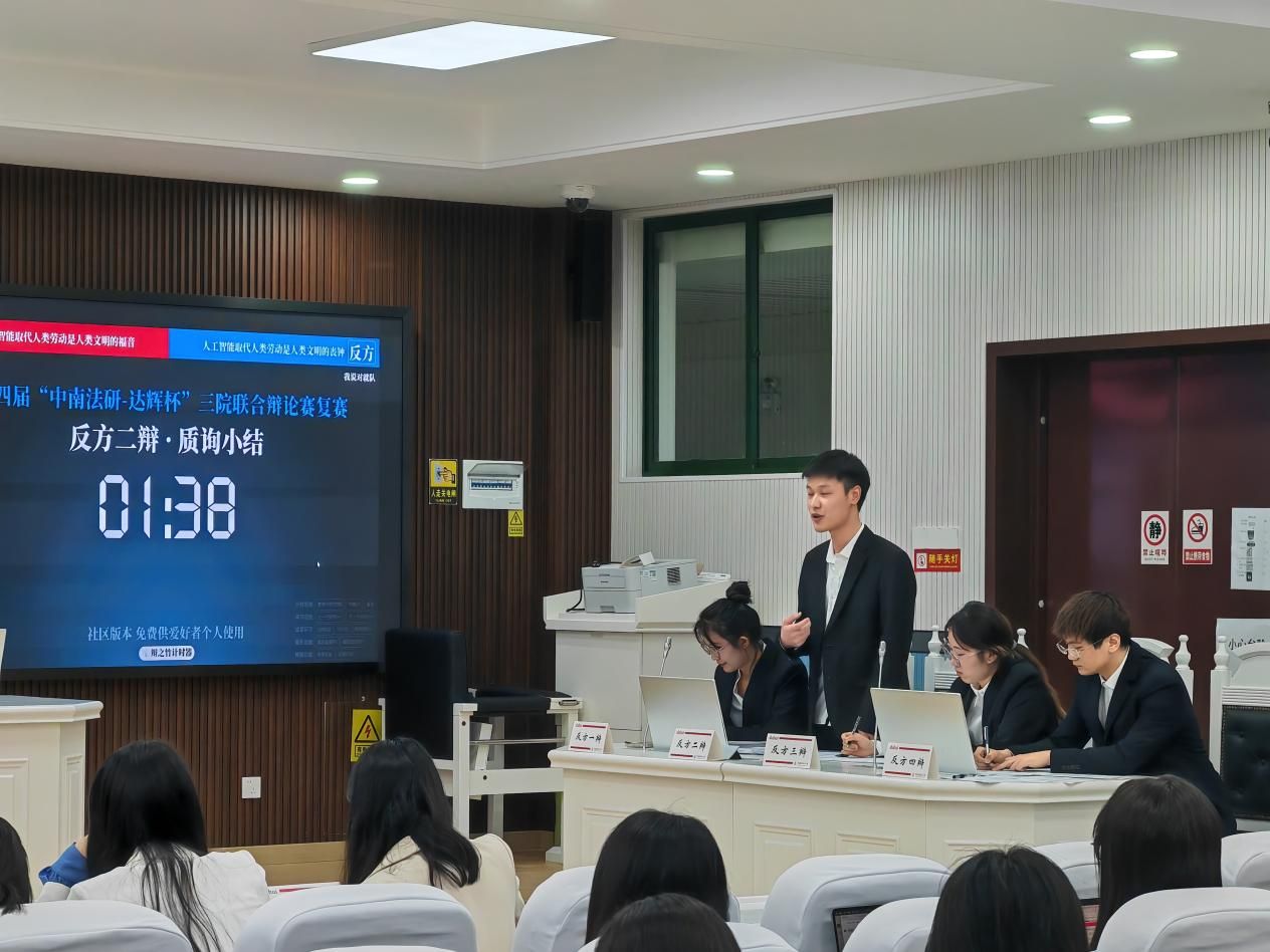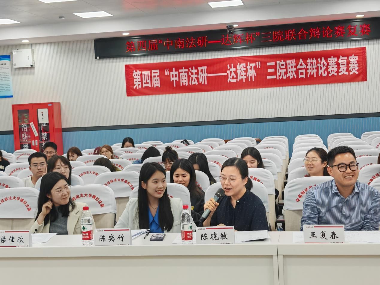 (通讯员 陈庆瑶 王济安 摄影 王嘉宁)为锻炼同学们的逻辑思维,发扬思辩精神,丰富全校辩论文化,4月18日下午,由中南财经政法大学法学院研究生会主办、法律硕士教育中心研究生会、刑事司法学院研究生会与达辉律师事务所协办的第四届“中南法研——达辉杯”三院联合辩论赛复赛在文泰楼模拟法庭二顺利举办。本次辩论赛复赛邀请到达辉律师事务所陈奕竹、中南财经政法大学法学院副教授陈晓敏、刑事司法学院副教授王复春、法学院梁佳欣老师担任评委,比赛由付雅睿主持。