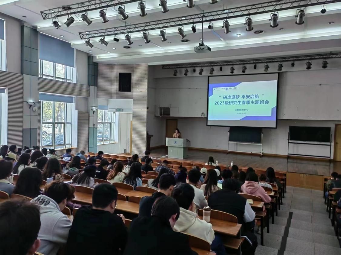 (通讯员 王致海 摄影 张涛)为帮助2023级法硕学子进一步增强学业规划意识,提高研究生日常管理工作效率,同时认清就业形势,树立正确的择业观、就业观,3月28日,法律硕士教育中心于文澜楼111会议室举行“研途逐梦 平安启航”2023级研究生春季主题班会,会议由研究生辅导员周诗琪老师主持,特别邀请了法学院党委副书记、法律硕士教育中心党总支书记易育老师作为主讲嘉宾,作职业规划安排专题讲座,2023级全体法律硕士参会。