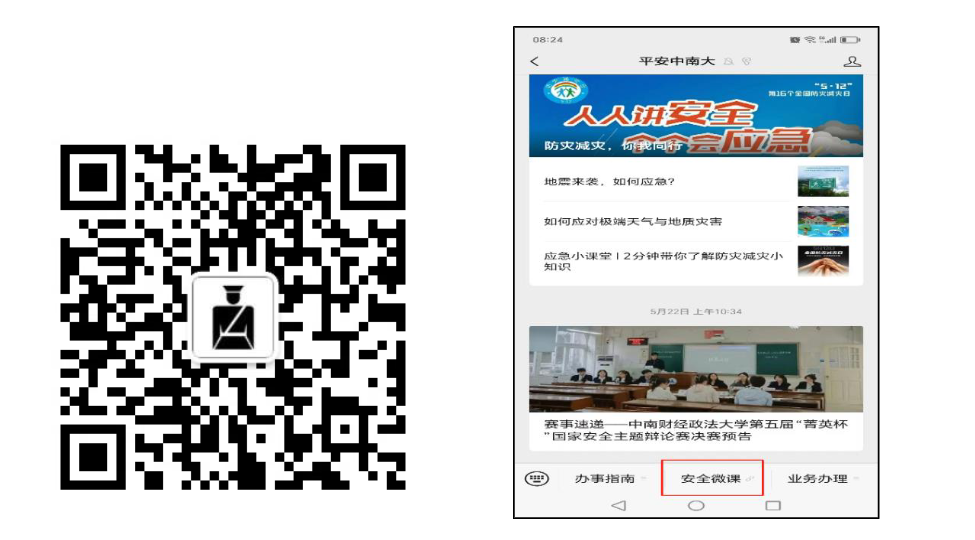 打开微信,关注公众号“平安中南大”,或者扫描下方二维码进入,点击公众号页面右下方的【安全微课】,进入绑定界面,在绑定界面填写选择院校名称(中南财经政法大学),使用学号作为账号、密码进行登录(可按照提示修改初始登录密码),即可进入首页。