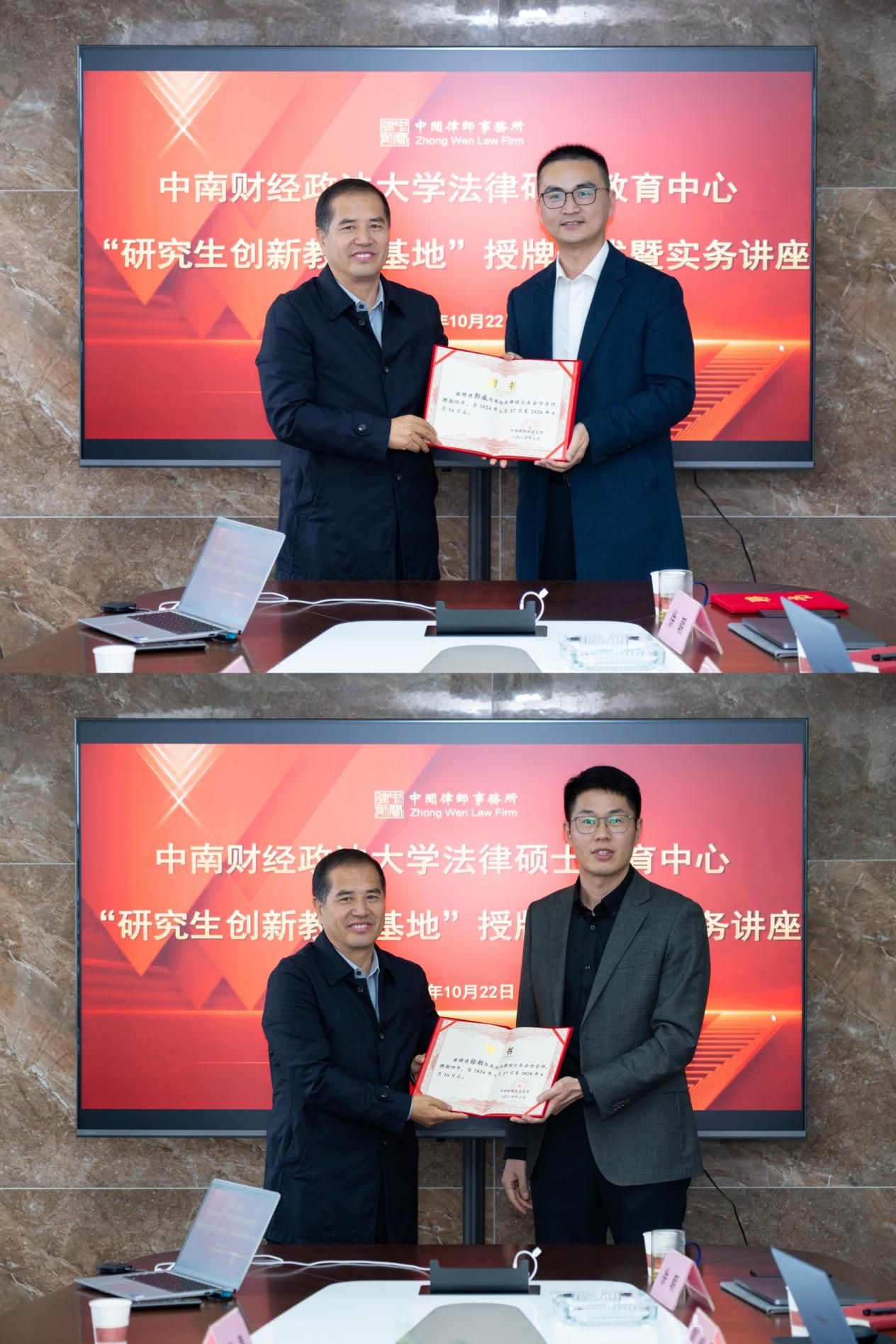 简基松主任为法律硕士教育中心合作导师郭威、徐朝授予聘书。