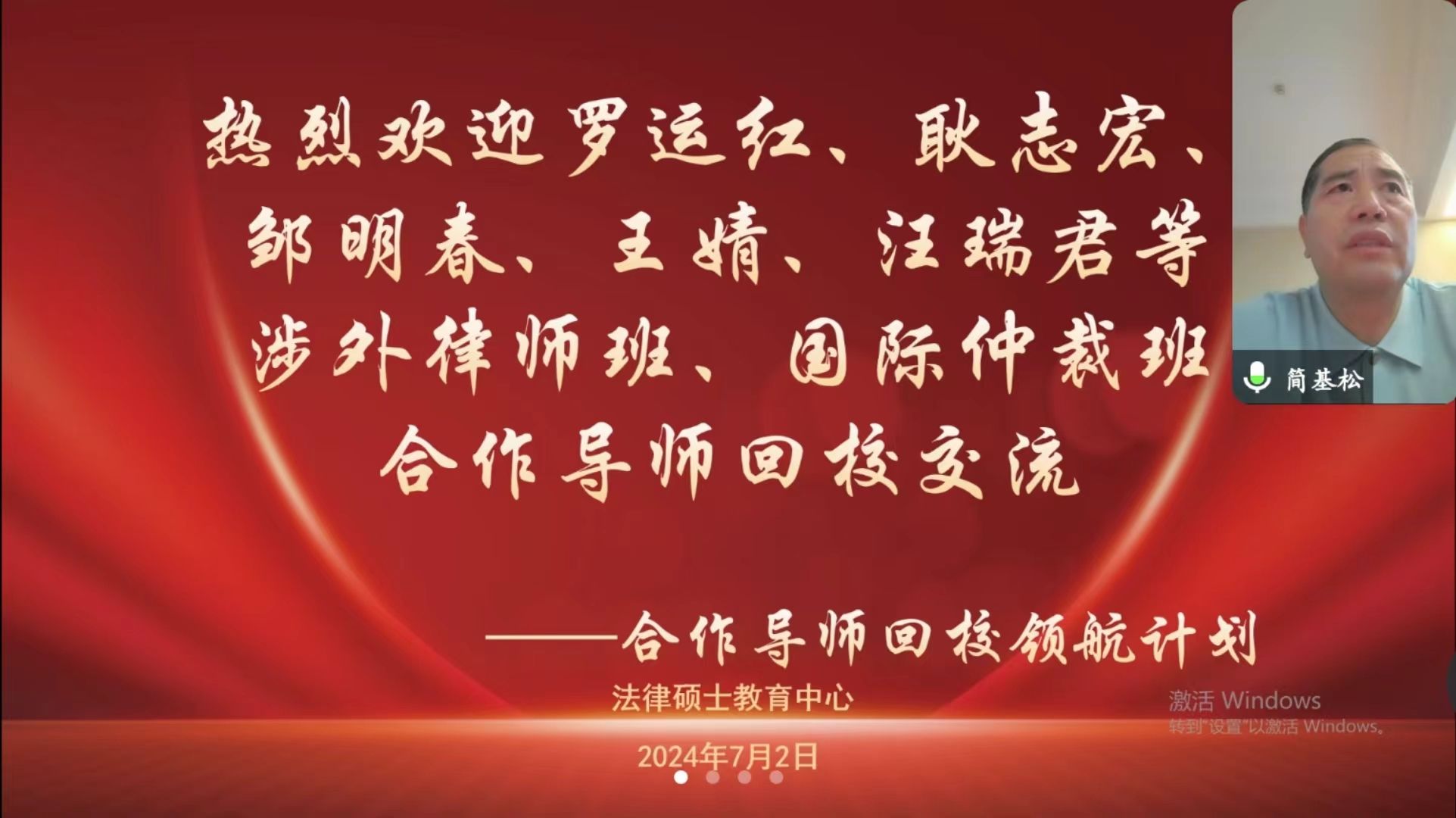 (通讯员周诗琪陈璇摄影 杨捷)为深入贯彻落实习近平总书记关于研究生教育工作的重要指示和教育部《关于深入推进学术学位与专业学位研究生教育分类发展的意见》文件精神,落实“双导师制”,全面提升法律硕士拔尖创新人才自主培养质量,法律硕士教育中心于7月2日上午在文治楼315会议室采用线上线下相结合的方式召开第十场“合作导师回校领航计划”涉外律师与国际仲裁方向专场合作导师与研究生见面会。至此,法律硕士在校生师生见面会实现全覆盖。法律硕士教育中心主任简基松,副主任王广波,学生党总支书记易育,国际仲裁导师组组长徐伟功,办公室主任侯竟,教学秘书杨捷,辅导员马晨娇、周诗琪,教学秘书陈璇,北京盈科(武汉)律师事务所涉外法律事务部主任罗运红、合伙人耿志宏,北京中伦(武汉)律师事务所合伙人邹明春、王婧,北京德恒(武汉)律师事务所合伙人汪瑞君,以及新加坡律明律师事务所合伙人葛黄斌,上海市建纬(北京)律师事务所合伙人宋玉祥,北京盈科(乌鲁木齐)律师事务所合伙人刘雪莲,上海英科律师事务所主任李见刚,泰和泰(北京)律师事务所合伙人贾圣囡等合作导师线上参加本次见面会。会议由王广波主持。