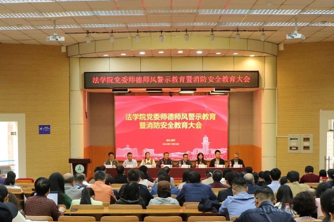 为大力弘扬教育家精神,推动师德师风警示教育走深走实,增强教职工消防安全意识和消防安全能力,11月14日下午,法学院党委在文潭楼一楼报告厅召开师德师风警示教育暨消防安全教育大会。法学院、知识产权学院(知识产权研究中心)、法律硕士教育中心、国家治理学院党政领导及全体教职工参加会议。会议由法学院院长、国家治理学院院长、法学院党委副书记陈柏峰主持。