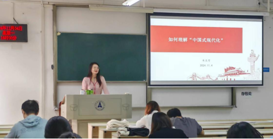 朱亚男老师以“理解中国式现代化”为题,从习近平新时代中国特色社会主义思想产生的时代背景、科学体系、实践要求的三个部分展开讲述,告诫新时代青年要从习近平新时代中国特色社会主义思想中汲取智慧和力量,积极投身实践,努力创造出经得起历史和人民检验的新功。