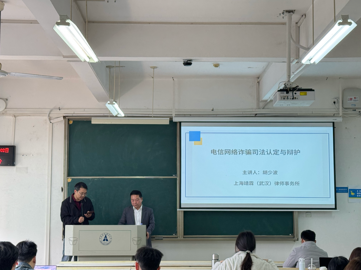(通讯员 杨捷 黄紫兰)为深入贯彻落实习近平总书记对研究生教育工作的重要指示精神,立足实践导向深化人才培养模式创新,持续推动产学研协同育人体系建设,以高质量法治人才培养服务新时代发展需求,法律硕士教育中心于42日在文添楼316教室举办中南法硕论坛“实务导师进课堂”2025年第三期讲座。本次讲座由法律硕士合作导师、上海靖霖(武汉)律师事务所主任胡少波主讲,主题为《电信网络诈骗犯罪的司法认定与辩护》。法律硕士(刑事法律与实务)方向导师李正新老师参与与谈,法律硕士教育中心副主任王广波、教学秘书杨捷随堂听课学习。